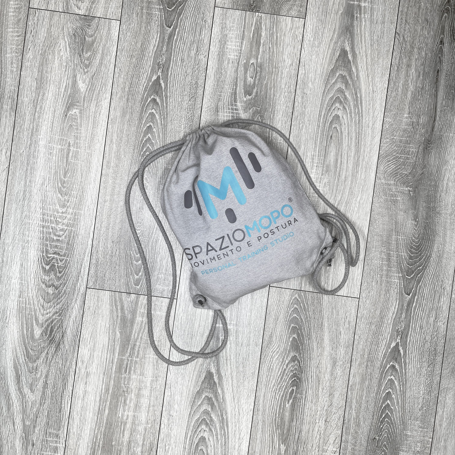 Sacca in tela colore grigio melange con logo Spazio MOPO® a colori.