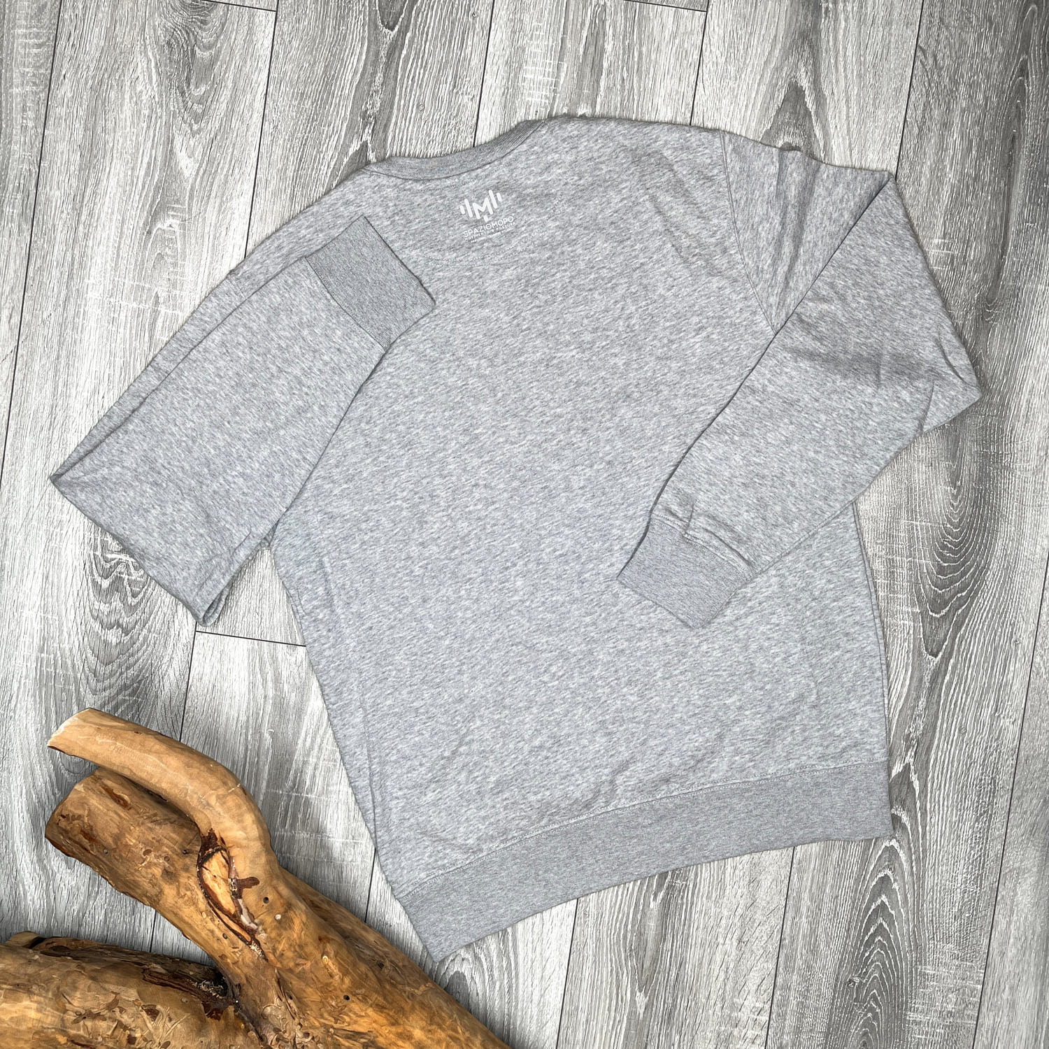 Felpa unisex girocollo da 300 gsm, colore grigio melange, con stampa logo Spazio MOPO® in bianco lato cuore. Necktag bianco sul retro.
